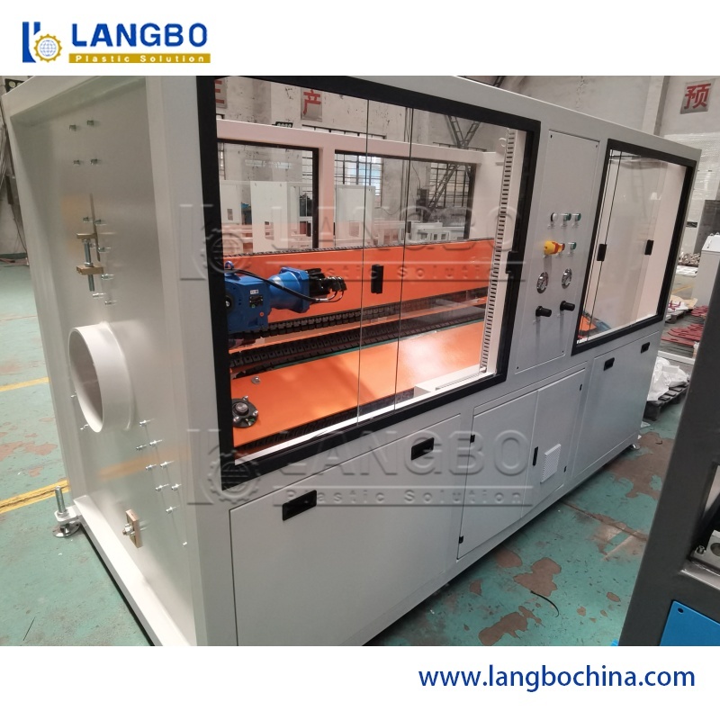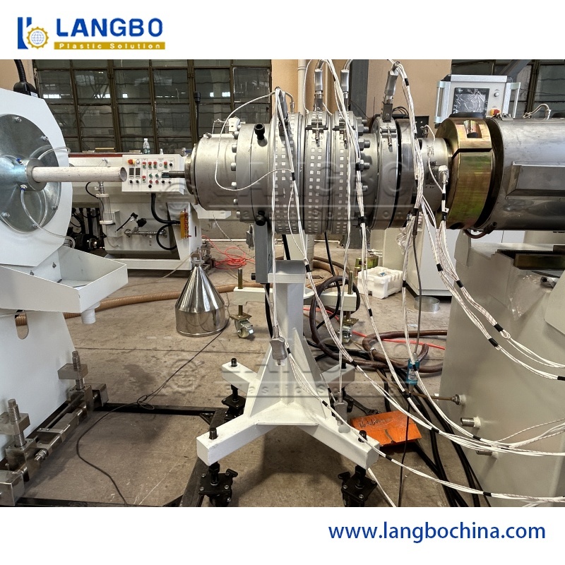 原料+添加剤 → 混合 → 材料搬送 → 強制供給 → 円錐二軸押出機 → 押出金型 → 直径制御ユニット → スプレー真空成形ボックス → スプレー/浸漬式冷却水槽 → マーキング機 → クローラートラクター → カッター → パイプ拡管機 → パイプスタッカー → パイプ検査・梱包